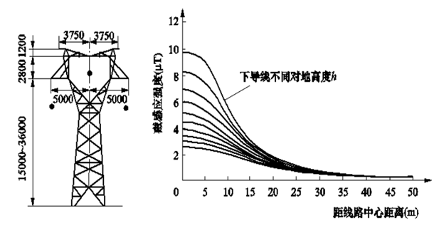 圖1列舉了220kV電壓等級,采用貓頭型鐵塔,三相單回路,導(dǎo)線呈三角型布置的輸電線路下,離地1m高度處的磁場橫向分布計(jì)算曲線。曲線以鐵塔中心線為坐標(biāo)原點(diǎn)(O點(diǎn)),顯示了磁感應(yīng)強(qiáng)度(磁通密度)隨距離的衰減關(guān)系。該圖曲線對應(yīng)的計(jì)算線路電流為300A(采用LGJ—300鋼芯鋁絞線),圖中曲線自上至下對應(yīng)導(dǎo)線對地計(jì)算高度h分別為8、9、10、11、12、13、14、15、16、17m。