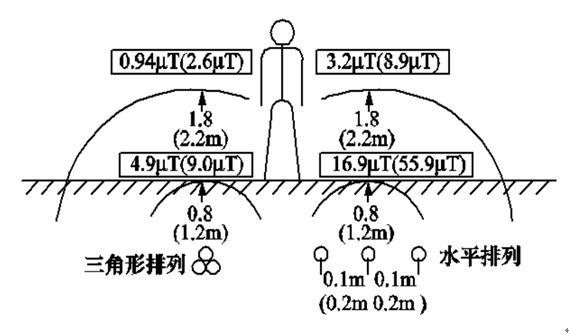 對于三相地下電纜輸配電線路,在其敷設(shè)位置上方地面所產(chǎn)生的磁場水平,取決于電纜埋設(shè)深度、3條相線之間的距離、導(dǎo)線的相對排列方式以及電纜中的工作電流。將三相3根電纜的間距減小,由于不同相位的三相磁場互相抵消的作用,可明顯降低地面的磁場;采用3芯電纜或?qū)⑷鄦涡倦娎|布置成三角形也可有效降低地面磁場。圖3-6給出了工作電流為300A的中壓(10~20kV)電纜(圖中括號外數(shù)據(jù))和工作電流為600A的高壓(110kV)電纜(圖中帶括號數(shù)據(jù))在常規(guī)埋設(shè)深度下產(chǎn)生的地面工頻磁感應(yīng)強(qiáng)度數(shù)值及分布示意圖。由圖3可見,在直接敷設(shè)地下電纜的地面上方路段,工頻磁感應(yīng)強(qiáng)度可達(dá)到10μT數(shù)量級,其數(shù)值比相應(yīng)架空線路產(chǎn)生的磁場更高,但其影響范圍相對較小。同樣的分析結(jié)論也可見于美國南加州愛迪生電力公司的設(shè)計(jì)導(dǎo)則中。