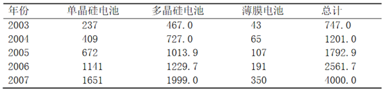 提高光電轉(zhuǎn)換效率和降低生產(chǎn)成本。太陽能光伏電池通常用晶體硅或薄膜材料制造,前者由切割、鑄錠或者鍛造的方法獲得,后者是一層薄膜附著在低價的襯背上。晶體硅仍是當(dāng)前太陽能光伏電池的主流。晶體硅電池包括單晶硅太陽電池和多晶硅太陽電池。單晶硅電池的實(shí)驗(yàn)室*高轉(zhuǎn)換效率可達(dá)24.7%,商業(yè)化電池效率為16%~20%。多晶硅太陽能電池的實(shí)驗(yàn)室*高效率也超過了20%,商業(yè)化電池效率為15%~18%。除效率外,電池的厚度也很重要。降低硅片厚度是減少硅材料消耗、降低晶硅太陽電池成本的有效技術(shù)措施。硅片的平均厚度已從2003年的0.23mm減小到2007年的0.18mm。下表為2003—2007年各類太陽能產(chǎn)量MW