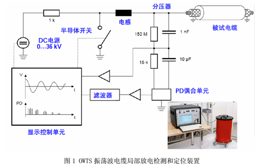 電力電纜由于其電容量大,很難在現(xiàn)場進(jìn)行工頻電壓下的局部放電檢測。過去充油電纜采用直流試驗,可以大大降低電源的要求。但對XLPE電力電纜,由于其絕緣電阻較高,且交流和直流下電壓分布差別較大,直流耐壓試驗后,在XLPE電纜中,特別是電纜缺陷處會殘留大量空間電荷,電纜投運后,這些空間電荷常造成電纜的絕緣擊穿事故。采用超低頻(0.1Hz)電源進(jìn)行試驗,要求試驗時間長,電纜絕緣損傷較大,可引發(fā)電纜中新的缺陷。振蕩波電壓是近年來國內(nèi)外研究較多的一種用于XLPE電力電纜局部放電檢測和定位的電源。該電源與交流電源等效性好,作用時間短、操作方便、易于攜帶,可有效檢測XLPE電力電纜中的各種缺陷,且試驗不會對電纜造成傷害。OWTS振蕩波電纜局部放電檢測和定位裝置如圖1所示。檢測時可以靈活施加0-28kV的直流電壓,合上半導(dǎo)體開關(guān)后,被試電纜與電感產(chǎn)生阻尼振蕩。該裝置可以檢測的電力電纜電容范圍為0.05uF-2uF。