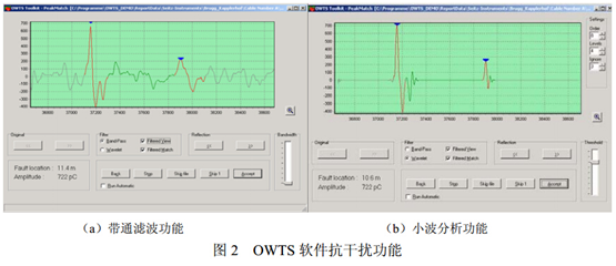 其中L為電纜長度,V為脈沖波在電纜中的速度,τ為兩個脈沖的時延。OWTS振蕩波電纜局部放電檢測和定位裝置采用該原理對電力電纜局部放電進(jìn)行定位,如圖5所示。