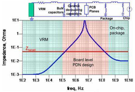 在調(diào)試該故障前先回顧下電源噪聲抑制的原理。如下圖所示,電源分配網(wǎng)絡(luò)中不同的頻段由不同的元件來抑制噪聲,去耦元件包含電源調(diào)整模塊(VRM)、去耦電容、PCB電源地平面對、器件封裝和芯片。VRM包含電源芯片及外圍的輸出電容,大約作用于DC到低頻段(100K左右),其等效模型是一個電阻和一個電感組成的二元件模型。去耦電容*好使用多個數(shù)量級容值的電容配合使用,充分覆蓋中頻段(數(shù)10K到100M左右)。由于布線電感和封裝電感的存在,即時大量堆砌去耦電容也難以在更高頻起到作用。PCB電源地平面對形成了一個平板電容,也具有去耦作用,大約作用在數(shù)十兆。芯片封裝和芯片負責高頻段(100M以上),目前的高端器件一般會在封裝上增加去耦電容,此時PCB上的去耦范圍可以降低到數(shù)十兆甚至幾兆。因此,在電流負載不變的情況下,我們只要判斷出電壓噪聲出現(xiàn)在哪個頻段,那么針對這個頻段所對應(yīng)的去耦元件進行優(yōu)化即可。在兩個去耦元件的相鄰頻段時兩個去耦元件會配合作用,所以在分析去耦元件臨界點時相鄰頻段的去耦元件也要同時納入考慮。