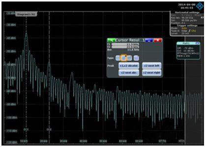 電源噪聲測量時不要求較高的采樣率,所以可以設(shè)置很長的時基,這也意味著采集的信號時間可以足夠長,可以認為覆蓋到了整個有效信號的時間跨度,此時不需要添加窗函數(shù)。調(diào)整以上設(shè)置可以得到比較準確的FFT變換曲線了,再通過zoom功能查看感興趣的頻點。如下圖中電源噪聲的主要能量集中在11.3KHz左右,并以該頻率為基波頻率諧振。據(jù)此可以推斷本PDN網(wǎng)絡(luò)在11.3KHz處的阻抗不能滿足要求,電容在該頻點的阻抗也比較高,起不到降低阻抗的作用,所以前面增加電容并不能減小電源噪聲。
