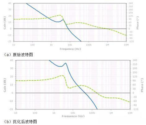 一般來說,11.3KHz應(yīng)該是VRM的管轄范圍,此處出現(xiàn)較大噪聲說明VRM電路設(shè)計不能滿足要求。這里對VRM的性能進行分析,VRM分析的方法眾多,此處主要采用仿真其反饋環(huán)路波特圖的手段。波特圖主要觀察幾個關(guān)鍵信息:1、穿越頻率,增益曲線穿越0dB線的頻率點;2、相位裕度,相位曲線在穿越頻率處所對應(yīng)的相位值;3、增益裕度,相位在-360°時所對應(yīng)的增益值。這里我們主要關(guān)注穿越頻率和相位裕度這兩個指標。從VRM的環(huán)路波特圖(如下圖a)可以看到,VRM的穿越頻率在8KHz左右,相位裕度37度。這里存在兩個問題:首先VRM的相位裕度一般需要大于45度才能保證環(huán)路的穩(wěn)定工作,這里相位裕度稍小一些,需要增加相位裕度;其次穿越頻率太低,穿越頻率附近VRM的調(diào)整作用逐漸降低,而此頻點bulk電容還起不到作用,所以在8KHz附近會存在較高的阻抗,這個頻點的噪聲抑制作用較差。下圖(b)是優(yōu)化VRM環(huán)路之后的波特圖,調(diào)整相位裕度到50度,穿越頻率推到46KHz左右。
